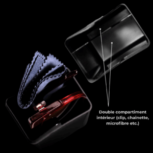 Son concept à deux espaces distincts permet de ranger la monture et ses accessoires (clip solaire, microfibre, chaîne, etc.) dans un seul écrin élégant et écoresponsable.