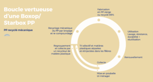 Fruit d’un an de recherche, notre nouvelle gamme de péniches, Boxop, recyclées et recyclables est fabriquée en PP Circulene, une matière composée à 99% de polypropylène recyclé post-consommation.