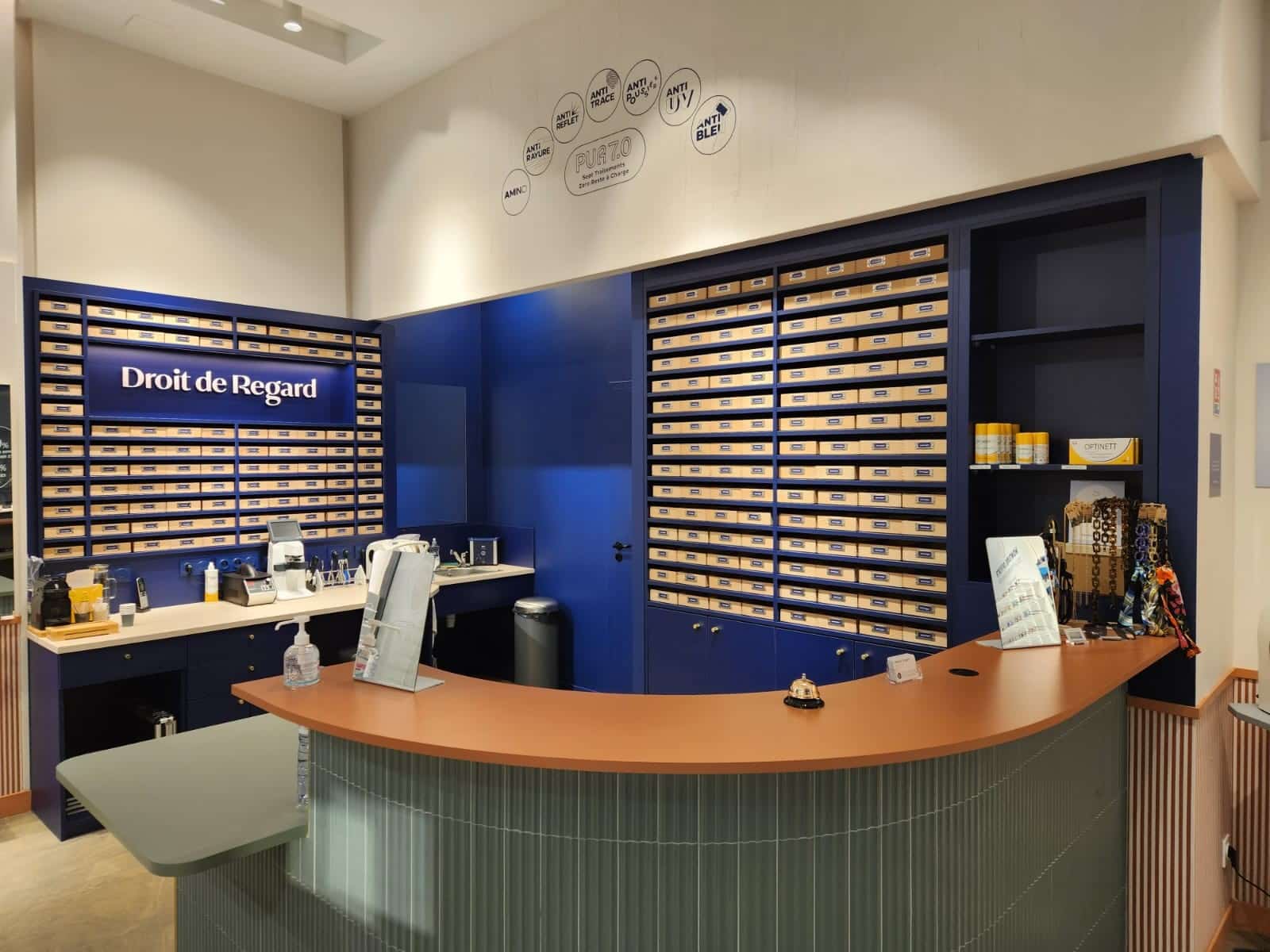 Les réalisations de meubles sur mesure de l’enseigne Droit de Regard avec nos péniches en bois sont un atout visuel indéniable pour chacun de leur point de vente avec une mention spéciale pour la dynamique chaleureuse de leur comptoir d’accueil à l’entrée des magasins.