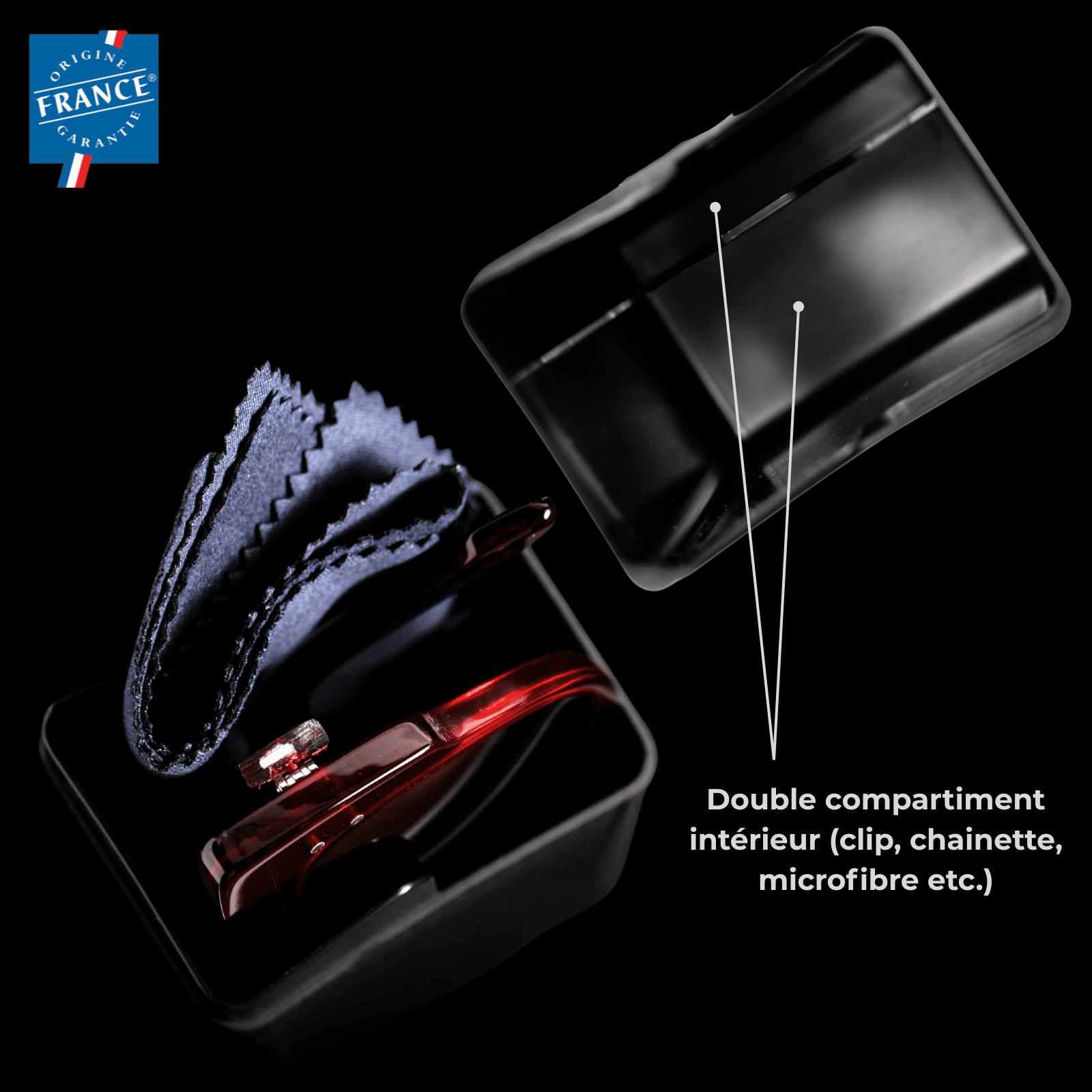 Véritable innovation, BoxTwoBox est le premier étui rigide double compartiment 100% français, certifié Origine France Garantie. Il s’adapte aux nouveaux usages et accessoires optiques (clip, microfibre, chaîne etc.) tout en apportant un vrai plus fonctionnel.