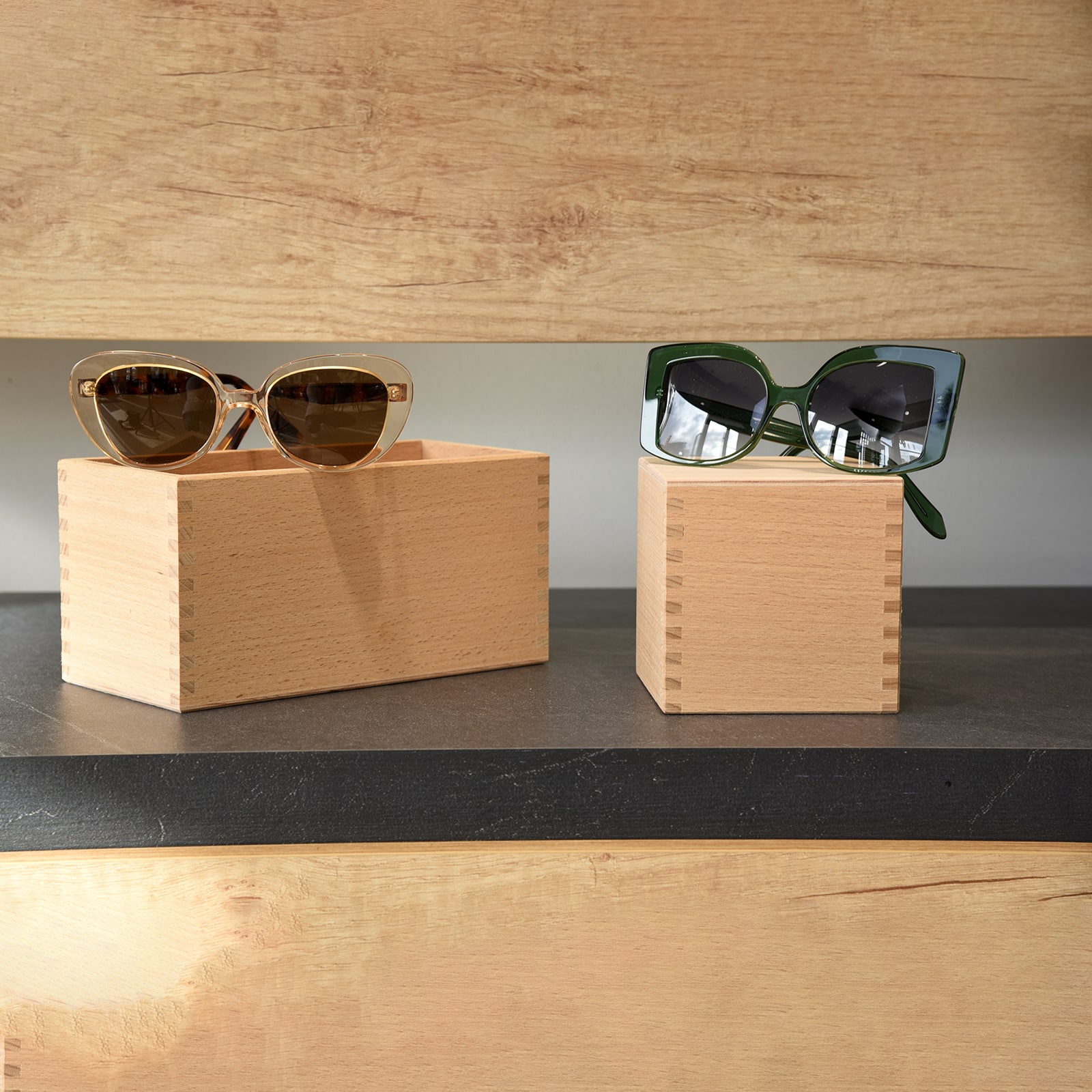 Le cube est un éléments de décoration polyvalent et esthétique, parfait pour animer et agencer les vitrines des magasins d’optique et d’autres commerces. Fabriqué en bois massif, les cubes ajoutent une touche naturelle et élégante à votre espace de vente tout en mettant en valeur vos montures et autres produits.