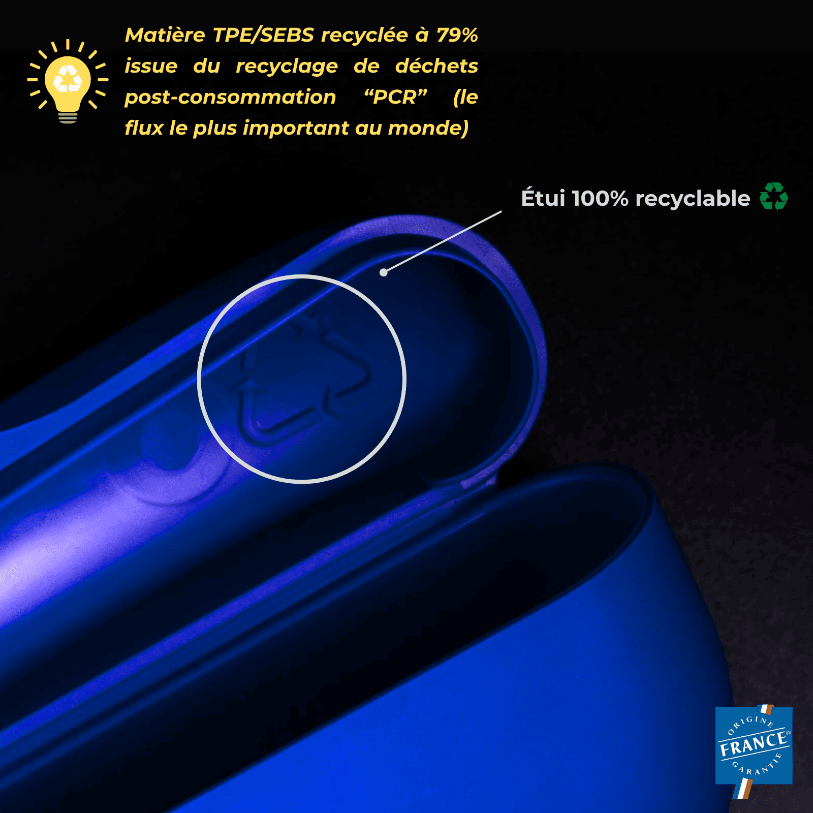 Dans le cadre de notre démarche 100% RSE et labellisé Origine France Garantie, Maïa est le fruit d’une innovation matière et de la fabrication française. Cet étui est conçu à partir du TPE/SEBS recyclé à 79% (issu de déchets post-consommation). Entièrement recyclable, l’étui Maïa affiche une empreinte carbone réduite de 37 % par rapport à un modèle standard. Maïa incarne ainsi une nouvelle génération de produits éthiques et traçables, conçus selon les principes d’une économie circulaire vertueuse.